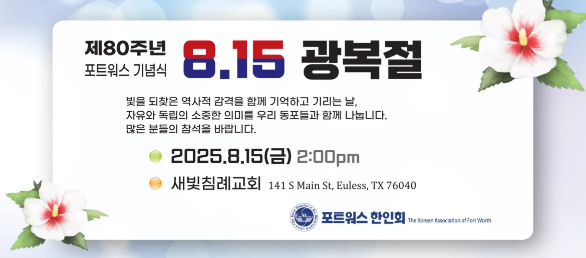 [AD] 제80주년 광복절 기념식 포트워스 한인회 by admin 2025-07-24 2025-07-24 449 You Might Be Interested In 포트워스 여성회, 추석잔치로 명절 분위기 ‘한껏’ 2024-09-09 [신년사] 포트워스 한인회 윤진이 신임회장 2025-01-09 포트워스 한인회, 따뜻한 송년 ‘한미 문화의 밤’ 2023-12-21 미주총연 서정일 총회장, 달라스 동포 간담회 개최 2024-12-06 [AD] 포트워스 한미 문화의 밤 2023-12-04 “통합을 넘어 화합으로!”…미주총연 달라스 임시총회 및 합동대회 ‘성료’ 2025-06-03 광복절제80주년 광복절포트워스 광복절 기념식포트워스 한인회 0 comments 0 FacebookTwitterPinterestEmail previous post “월세 내려면 시급 33달러 벌어야”…미 아파트 임대, 저소득층에 ‘그림의 떡’ next post 텍사스 A&M 박사과정 한인 영주권자, 귀국길에 ‘ICE 구금’ 관련기사 [AD] 드레곤 보트 페스티벌 2025-10-28 [공고] 북텍사스한국여성회 제17대 회장 선거 2025-10-15 [AD]달라스한인회 제40대 회장 선거공고 2025-09-25 [AD]달라스노인회 선거 공고 2025-09-25 [AD] 2025 한가위 대축제 2025-08-21 [AD]달라스한인회 선관위 위촉 공고 2025-08-13 [AD] 제80주년 광복절 기념식 2025-07-31 [광고] 북텍사스여성회 ‘회원 모집’ 2025-06-26 [AD] 달라스 미주체전 감사광고 2025-06-26 [AD]북텍사스 경찰국 자녀 장학행사 2025-06-06 Leave a Comment Cancel ReplyYou must be logged in to post a comment.