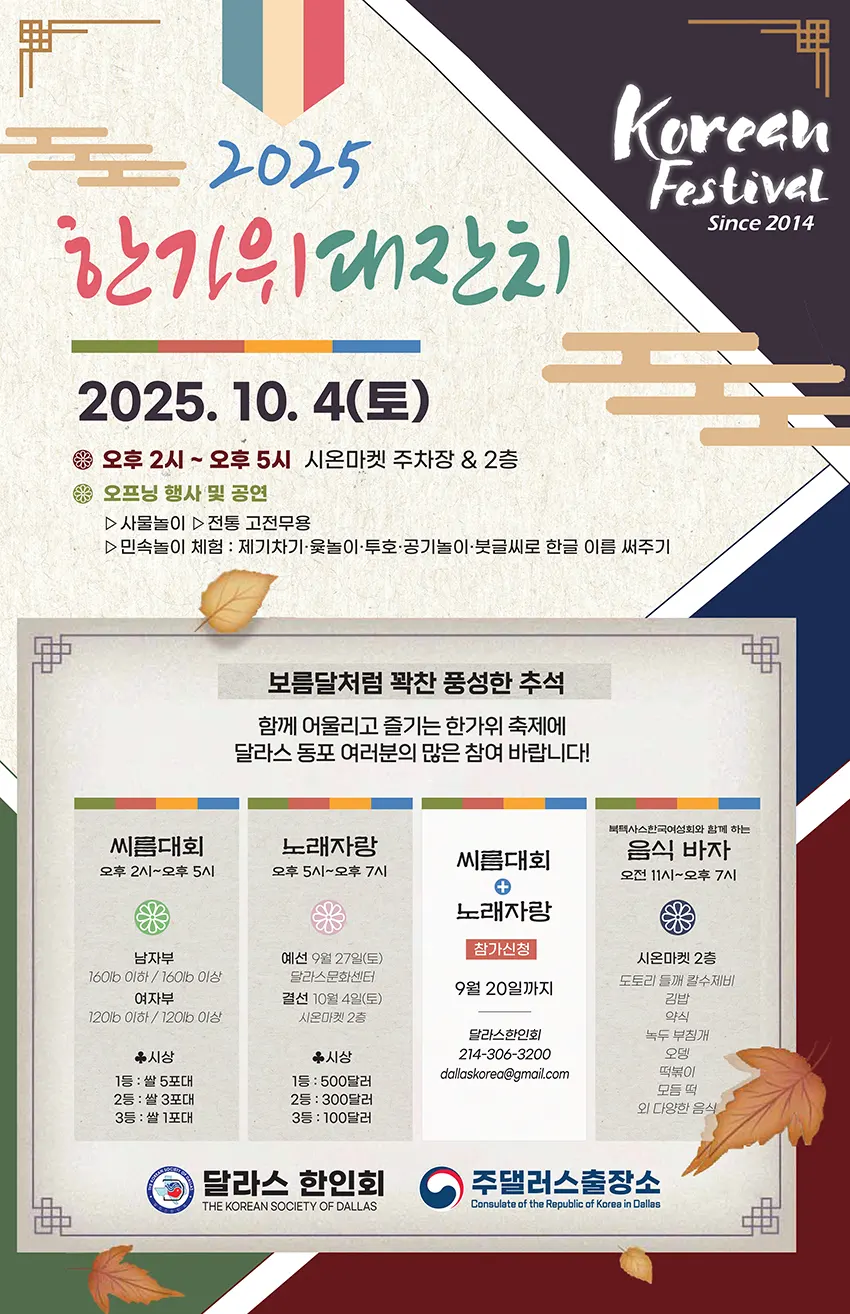 2025 코리안 페스티벌 & ‘한가위 대잔치’는 달라스 한인회(회장 김성한)와 주달라스출장소(소장 도광헌)가 공동 주최한다.