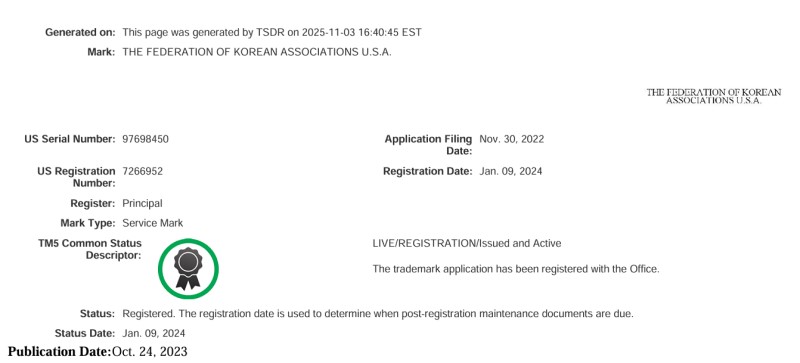 정명훈 회장측이 미 특허청(USPTO)에 ‘Korean American Federation of USA’와 ‘미주한인회총연합회’의 상표권을 신청한 것은 각각 2022년 11월 30일과 12월 1일이다. 법정다툼이 생기기 전이다. 두 건의 상표권 신청은 모두 2024년 1월 9일 정식 등록됐다.